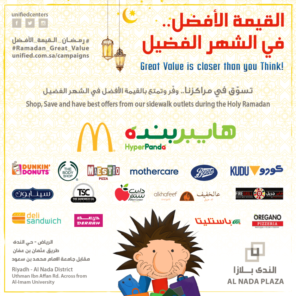 القيمة الأفضل GREAT VALUE IS CLOSER THAN YOU THINK! ( القيمة الأفضل بالشهر الفضيل ( الندى بلازا تسوّق في مراكزنا وفّر وتمتع بالقيمة الأفضل بالشهر الفضيل Shop, Save and have best offers from our side walk-outlets during the holy ramadan سجل الآن لتحصل على آخر العروض و الخصومات Name (الإسم) Email (الإيميل) Mobile (الجوال) CAPTCHA العروض و الخصومات موقع المركز Location Map ( خارطة الموقع )