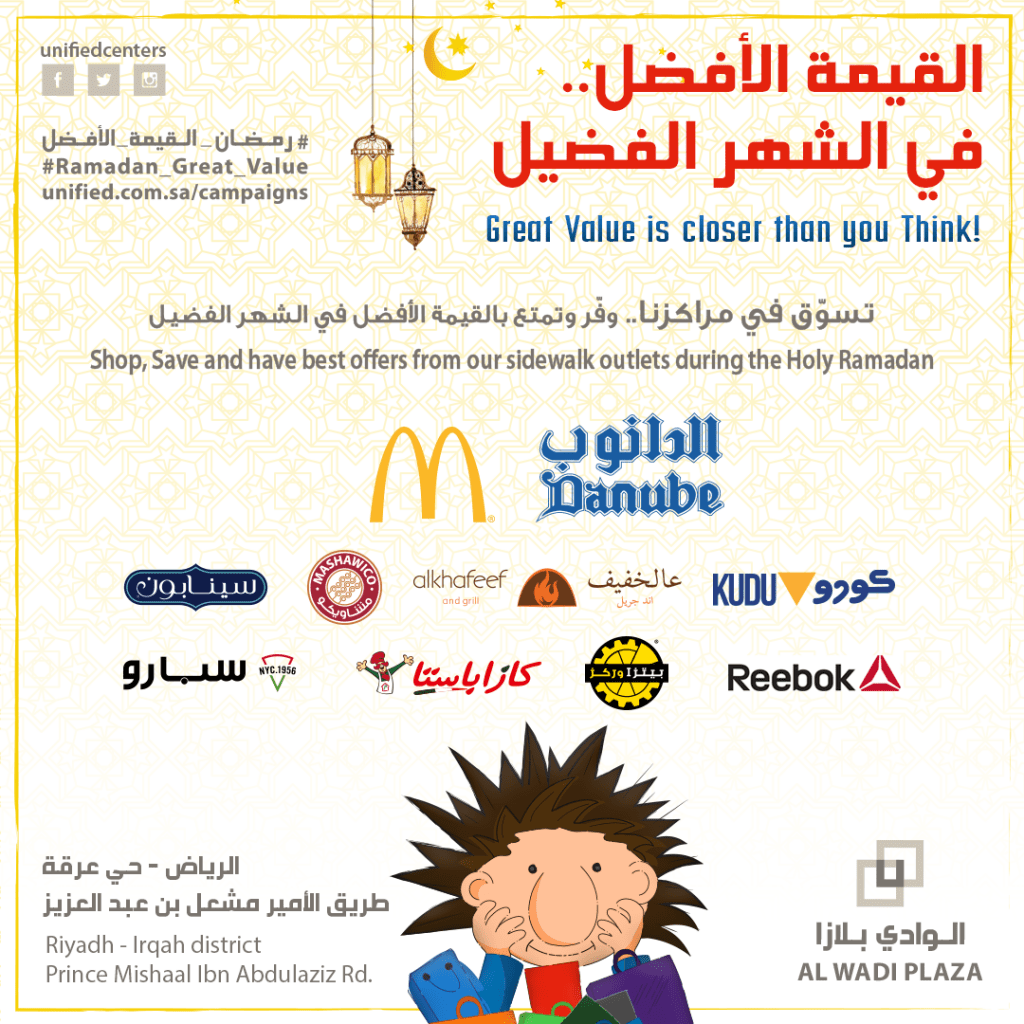 القيمة الأفضل GREAT VALUE IS CLOSER THAN YOU THINK! ( القيمة الأفضل بالشهر الفضيل ( الوادي بلازا تسوّق في مراكزنا وفّر وتمتع بالقيمة الأفضل بالشهر الفضيل Shop, Save and have best offers from our side walk-outlets during the holy ramadan سجل الآن لتحصل على آخر العروض و الخصومات Name (الإسم) Email (الإيميل) Mobile (الجوال) CAPTCHA العروض و الخصومات موقع المركز Location Map ( خارطة الموقع )